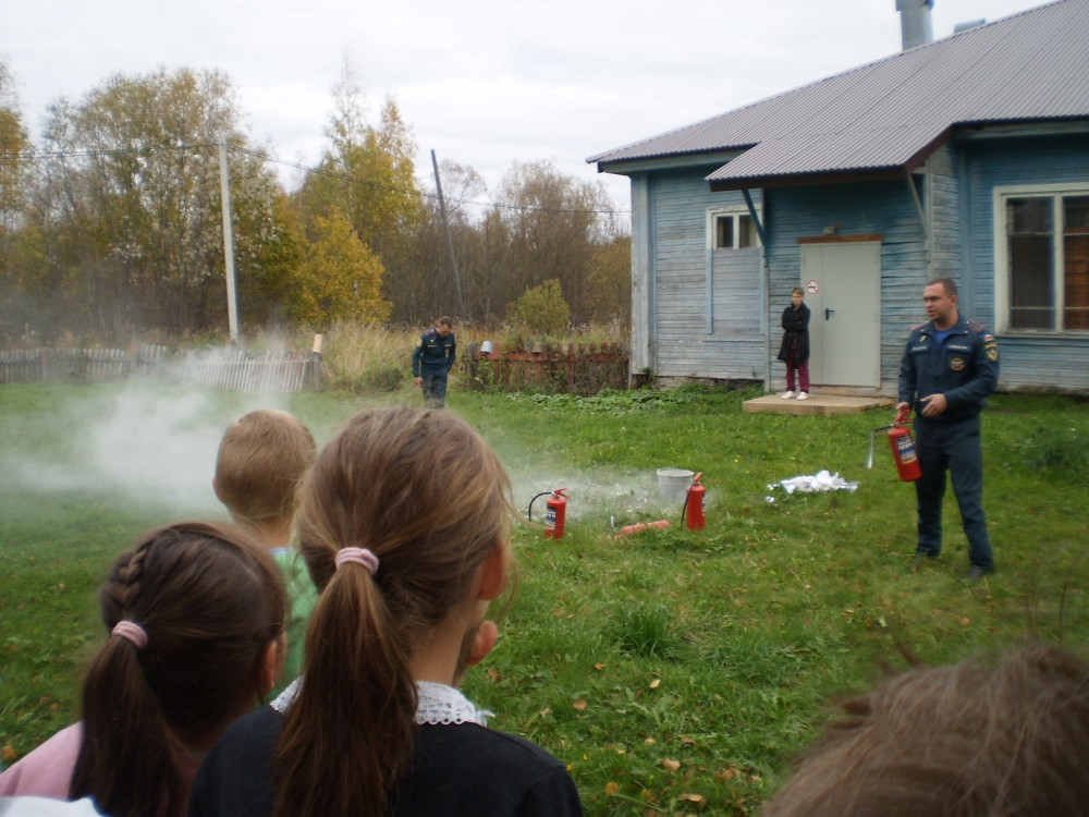 Когда ребята разошлись по классам, раздался сигнал, оповещающий о пожаре. Была организована эвакуация всех из школы. После проверки списков учащимся напомнили, как пользоваться огнетушителем, и была возможность самим потушить возгорание.