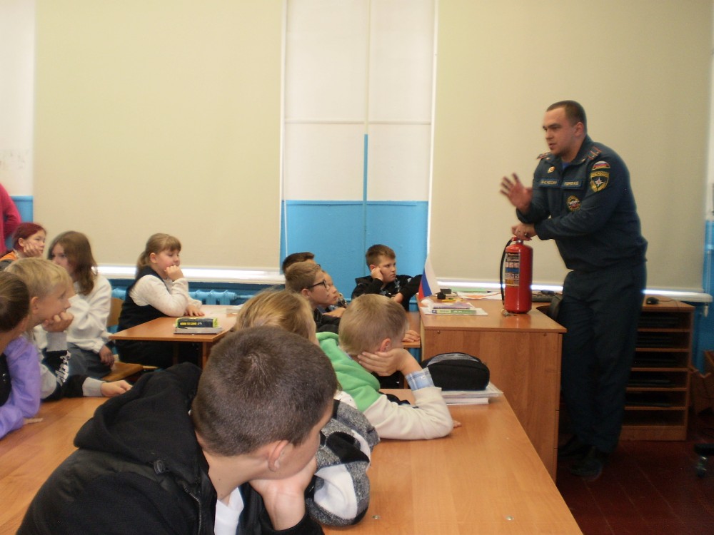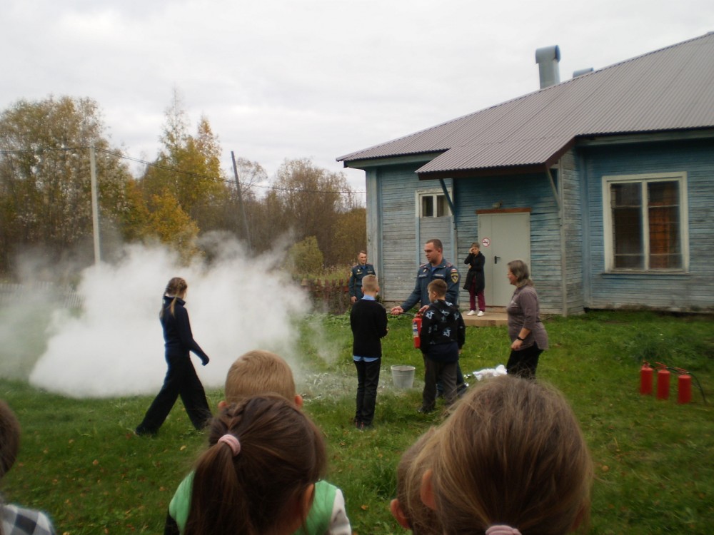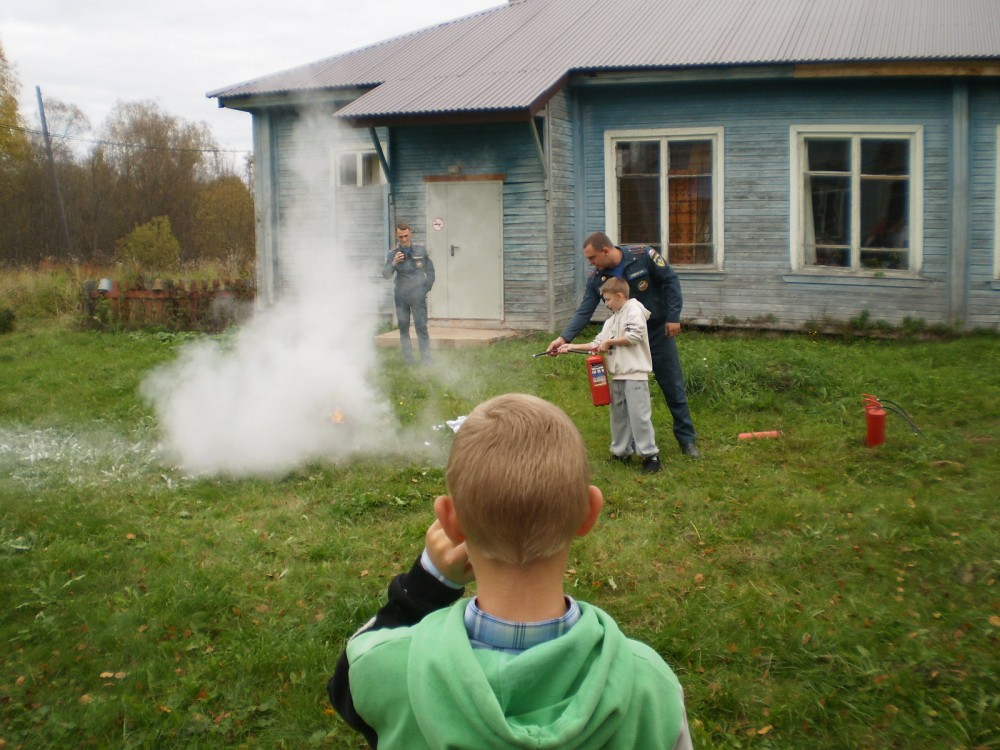 Когда ребята разошлись по классам, раздался сигнал, оповещающий о пожаре. Была организована эвакуация всех из школы. После проверки списков учащимся напомнили, как пользоваться огнетушителем, и была возможность самим потушить возгорание.